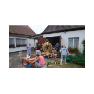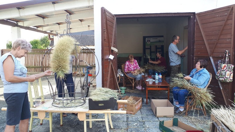 W dniu 27 sierpnia odbyło się uroczyste zakończenie prac przy nowej koronie dożynkowej. Osoby które włożyły najwięcej pracy w wykonanie wspaniałej korony spotkały się razem przy suto zastawionym stole i wspominały jak to przebiegały ich prace. Pierwsze spotkanie w sprawie korony odbyło się już w zimie. Panie z Rady Sołeckiej przedstawiły Sołtysowi wstępny projekt korony. Pierwsze prace przy koronie rozpoczęły się w drugiej połowie czerwca, kiedy to panie pojechały zbierać zboże i wyselekcjonować te najdorodniejsze kłosy. W połowie lipca Sołtys wykonał stelaż korony i wtedy rozpoczęto pleść koronę. W kolejnych dniach i tygodniach prace nabierały tempa i zakończyły się w II połowie sierpnia. W pracach tych uczestniczyło w sumie kilkanaście pań. Zajęcia były podzielone na dwa etapy: przygotowanie poszczególnych elementów w domach i prace bezpośrednio przy koronie.