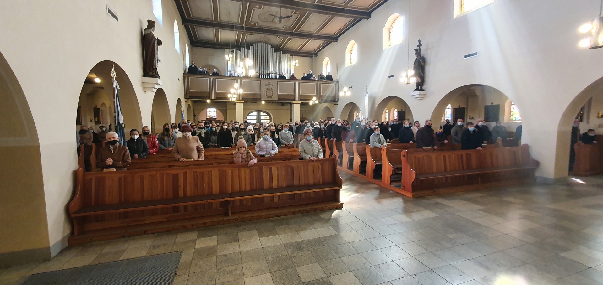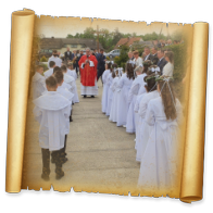 Następnie procesyjnie wprowadzono Ks. bp do kościoła przy spiewie "Błogosławiony, który idzie..." następnie ks. proboszcz odśpiewał na przemian z ludem wezwania i odmówił modlitwę. Po odspiewaniu piesni ku czci patrona "Święty Józefie patronie nasz.." oraz odśpiewaniu kolekty przez ks. biskupa rozpoczęła się Msza św. Na początku Mszy ks. probośc przywitał ks. biskupa i przedstawił krótkie sprawozdanie z życia religijnego parafii.