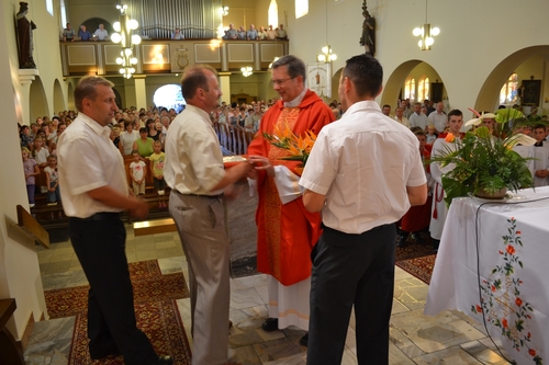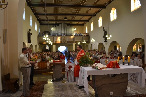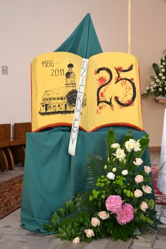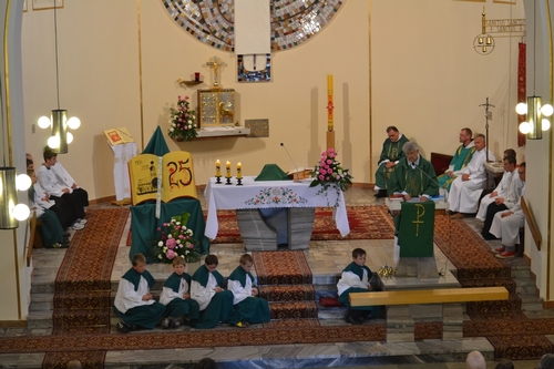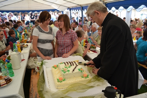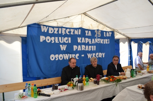 W dniu 13 sierpnia o godz. 16.00 w kościele parafialnym odbyła się Msza Św dziękczynna z okazji 25-lecia posługi w naszej parafii ks. proboszcza Franciszka Lercha. W kościele zgromadziło się bardzo dużo parafian aby podziękować księdzu. W niewielu parafiach jest okazja świętowania 25-lecia posługi kapłańskiej proboszcza. W zeszłym roku w czasie uroczystości 50-lecia kapłaństwa ks. Franciszka Lercha zrodziła się myśl, że parafianie przygotują taką uroczystość. Spotkanie to sfinansowane zostało ze środków parafian z Kolanowic, Osowca, Trzęsiny i Węgier, które pozostały z organizacji 50 lecia kapłaństwa i do dnia dzisiejszego zdeponowane były na koncie bankowym. Od rana trwały gorączkowe przygotowania do oprawy zewnętrznej tej uroczystości. Mieszkańcy Osowca ustawiali namioty, przywozili z pobliskich miejscowości ławki aby ugościć jak najwięcej osób. Wewnątrz w namiotach i w świątyni panie z Osowca wykonały dekoracje oraz przystroiły stoły. Przystrojeniem tortu oraz przygotowaniem ciasta, które upiekły gospodynie ze wszystkich miejscowości naszej parafii zajęły sie panie z Węgier. Mieszkańcy Osowca zajęli się dostarczeniem oraz przygotowaniem i podaniem kolacji. Pogoda jednak nas nie oszczędzała i mimo, iż trzy razy przeszła ulewa to nie przeszkodziło nam w przygotowaniach. Po Mszy Św. wszyscy przeszli do namiotów gdzie odśpiewano księdzu sto lat. Miejscowa orkiestra, która uświetniała uroczystość w kościele przygrywała również na placu wszystkim uczestnikom. Spotkanie odbyło się w miłej atmosferze i trwało do godz. 20.00. więcej zdjęć